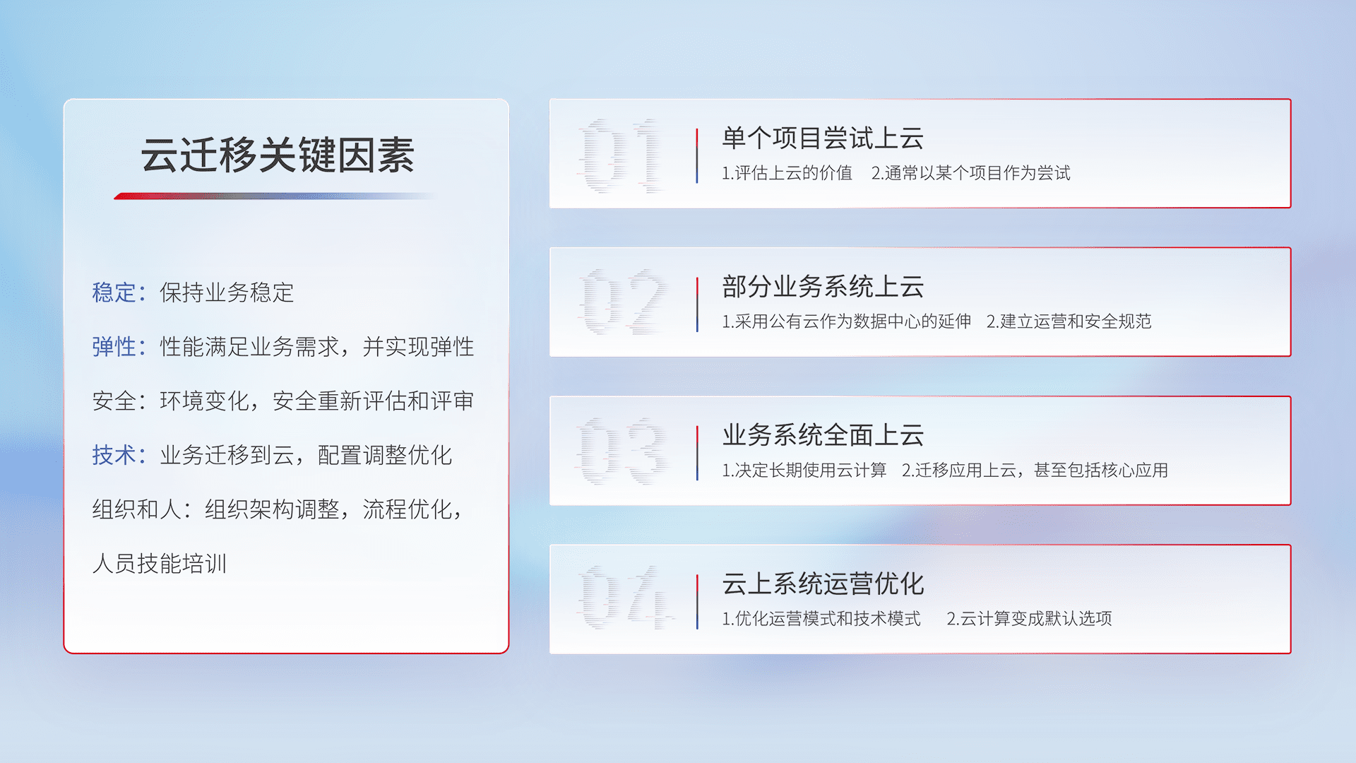 结合实际业务,,,从规划设计、、、、云平台选型、、、云原生改造、、数据迁移、、集成交付,,,迁移全过程为客户识别最佳上云路径,,,,做好风险识别管理,,设计网络架构、、身份权限、、安全审计合规、、、、操作审计、、、日志审计、、监控告警策略、、、、多站点容灾设计等,,对云上基础设施进行整体规划,,,提升IT治理水平,,,以满足弹性、、高可用、、、高性能的需求。。