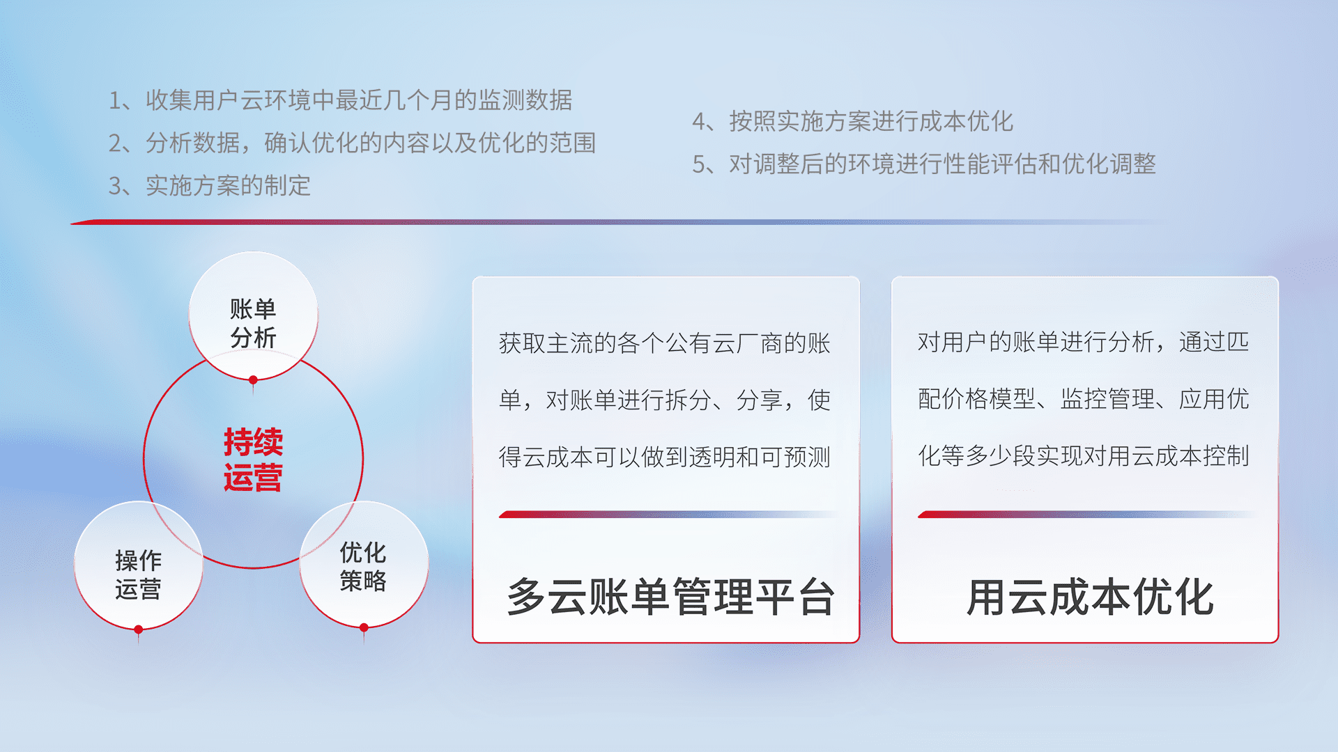 通过多云纳管,,以统一的资源数据模型把客户的云资源进行抽象和封装,,,,进而实现对多云资源的统一操作,,,保障云资源管理的可靠性、、稳定性与可用性。。量身定制化运维内容,,配置、、开发运维、、、补丁管理、、备份、、、、监控、、、认证和访问管理、、审计和日常巡检等,,保障在用云过程中的可靠度,,稳定度以及高可用率。。。